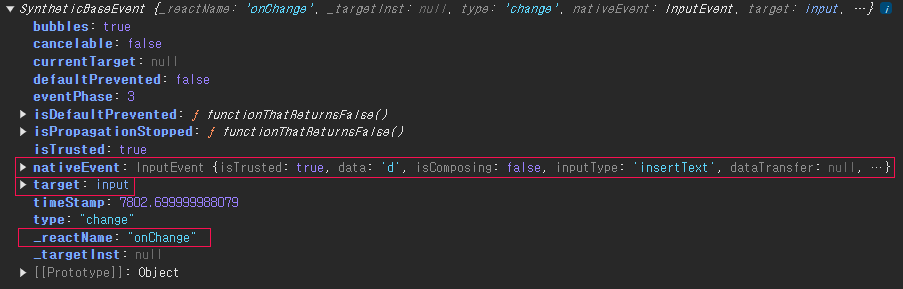 보면 이름이 'SyntheticBaseEvent'라고 되어 있고, 원본 이벤트 객체인 NativeEvent를 비롯한 다양한 정보를 가지고 있다.
