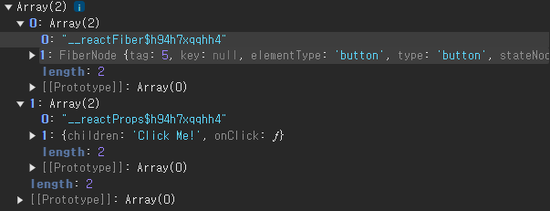 리액트 내부 합성 이벤트 시스템이 root 이벤트 리스너로부터 네이티브 이벤트를 전달받으면 해당 이벤트 객체의 target을 통해 이 이벤트를 발생시킨 요소와 매핑되는 파이버 노드를 찾아낸다. 그렇다. DOM에서 파이버로 역추적 하는 것이다. event.target에는 대응되는 파이버 노드가 비공개 프로퍼티로 숨겨져 있다. 이벤트 핸들러 안에서 Object.entries(event.target)을 콘솔에 출력하면 실제로 __reactFiber$xxx와 같은 프로퍼티가 파이버 노드를 값으로 하면서 들어 있는 것을 확인할 수 있다. (파이버 노드 뿐만 아니라 props도 저장되어 있다.)