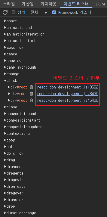 root에는 네이티브 이벤트 리스너가 전부 달려 있다. 리액트가 앱을 최초로 렌더링할 때 네이티브 이벤트 목록을 순회하면서 각 이벤트에 대한 리스너를 root에 추가해놓기 때문이다. 실제로 개발자 도구에서 root에 해당하는 요소를 클릭하고, 이벤트 리스너 패널을 열면 root에 추가되어 있는 이벤트 리스너 목록을 확인할 수 있다.