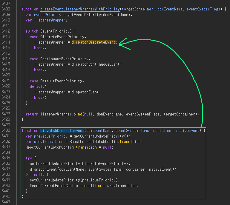 dispatch...Event 꼴의 함수가 createEventListenerWrapperWithPriority라는 함수에서 호출되어 listenerWrapper로써 반환되고 있다. 다시 말해 리액트는 이벤트 리스너를 한 번 감싼 Wrapper 함수를 만들고 이걸 root에 추가하여, 브라우저 이벤트를 감지하고 이를 리액트 코드 내부 이벤트 시스템으로 이동하는 구조를 갖춘 것이다.