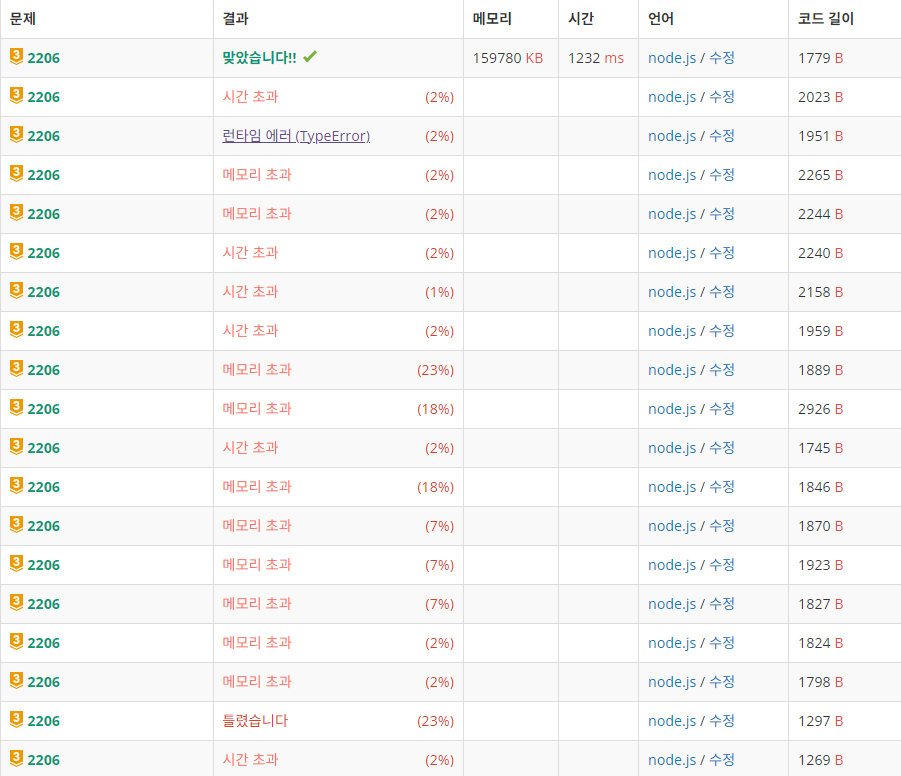 질문 게시판에 있는 반례들은 다 해봤고, 모두 정답이었다. 하지만 메모리 초과가 났다.